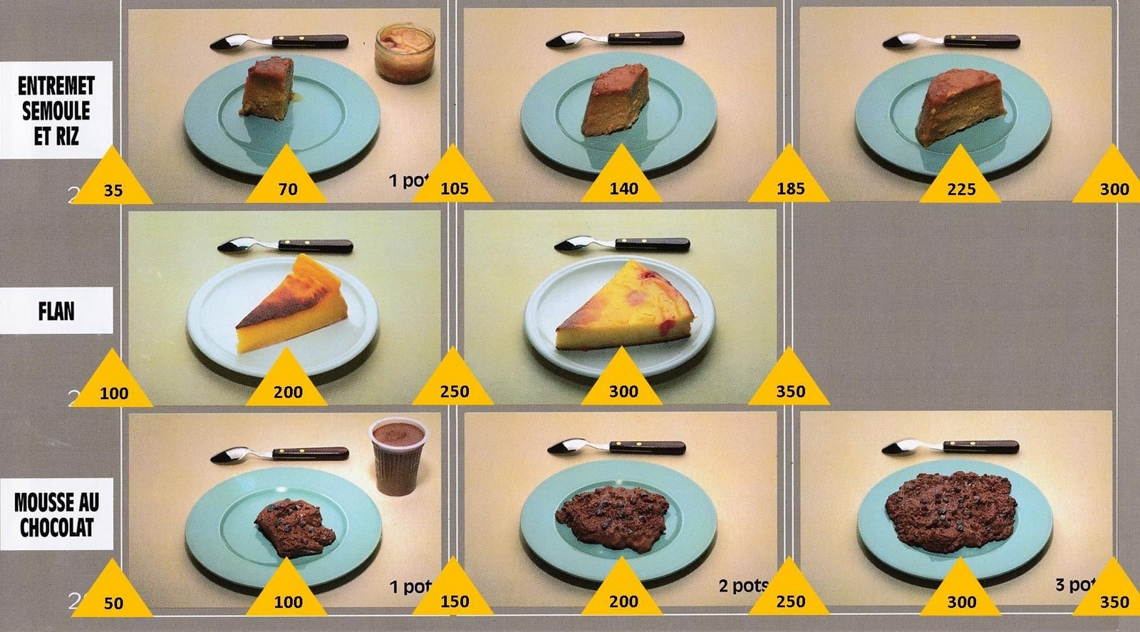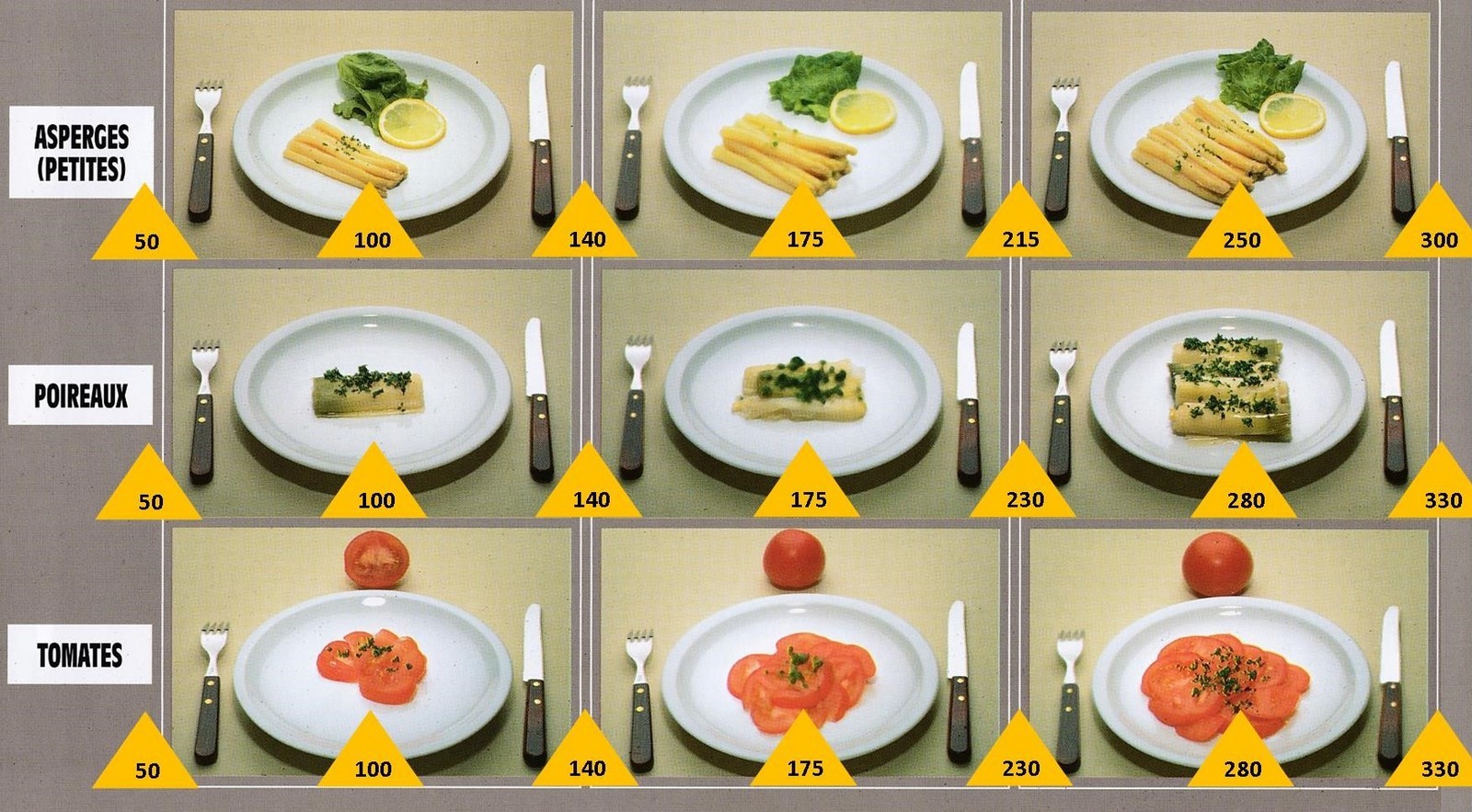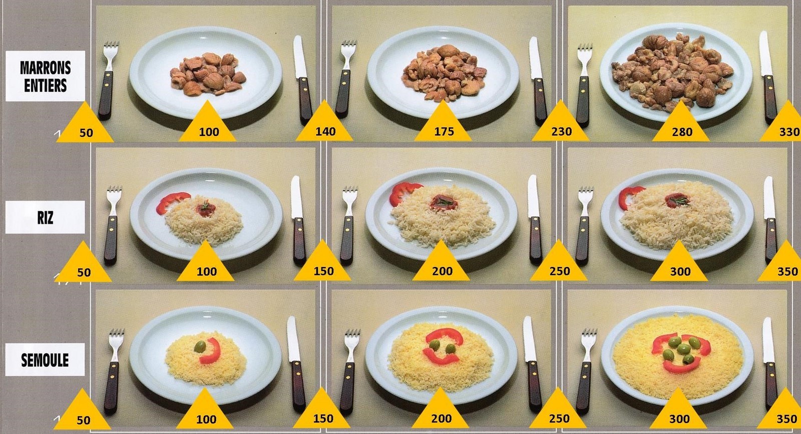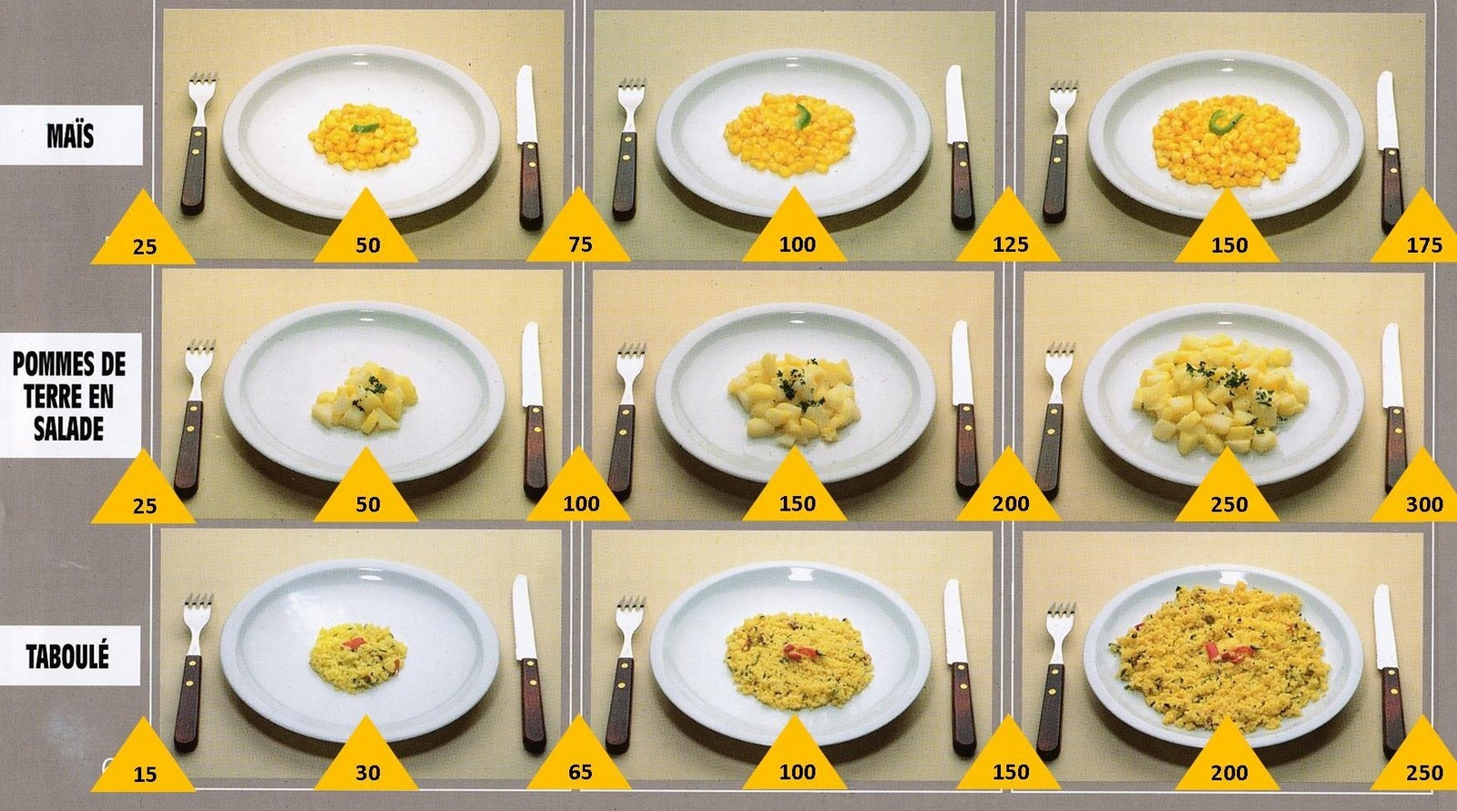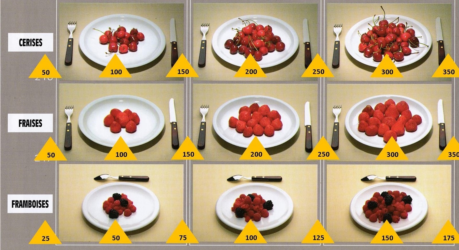 Le poids des aliments est noté dans les triangles jaunes, en grammes pour les aliments solides, en millilitres pour les aliments liquides.