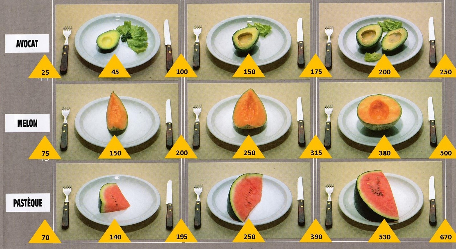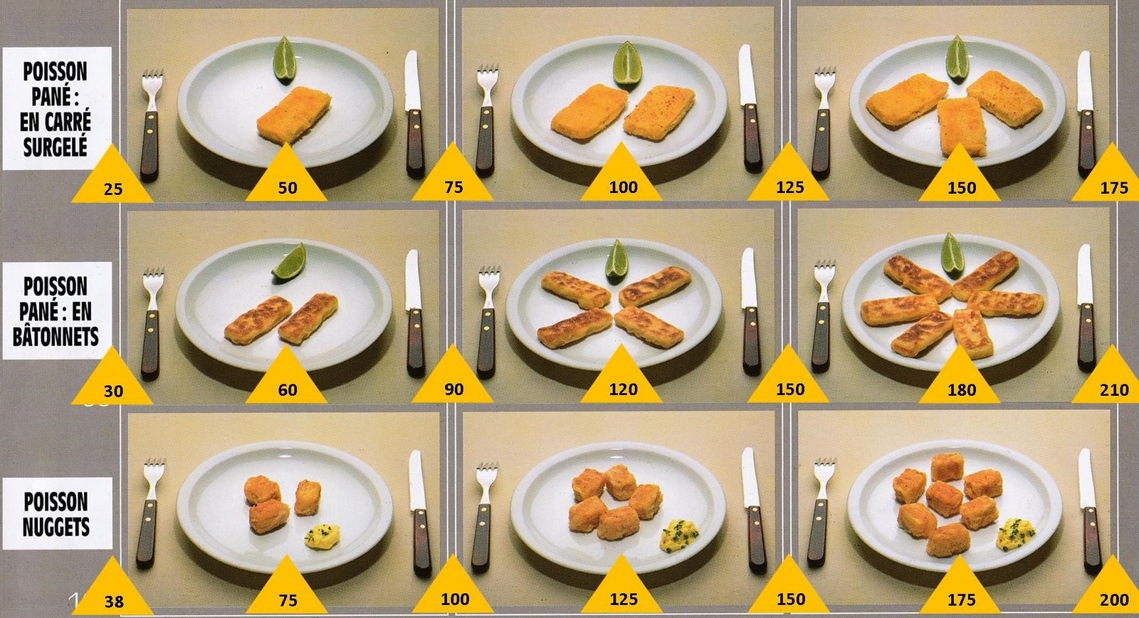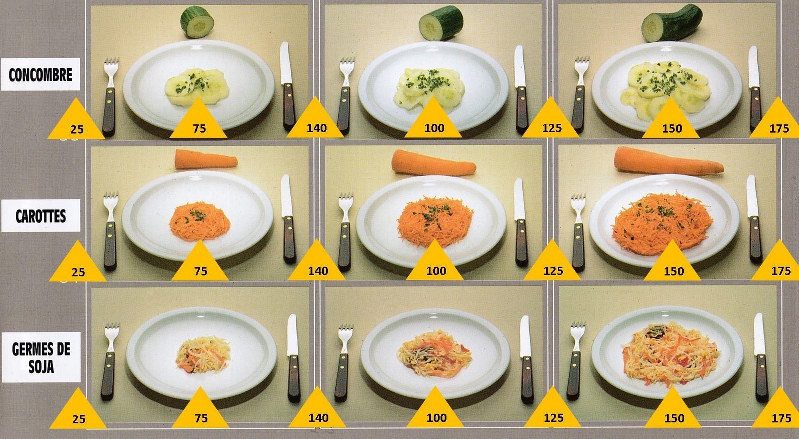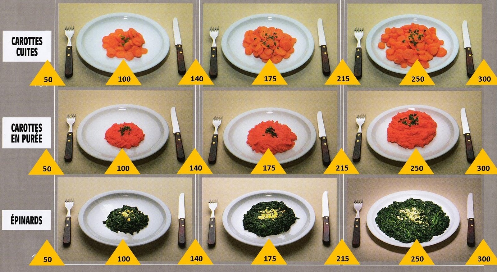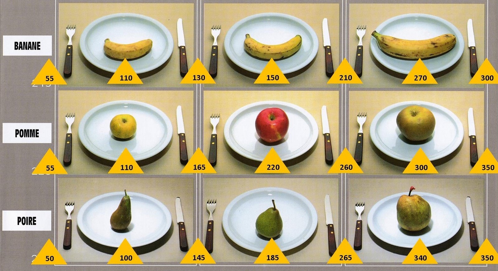 Le poids des aliments est noté dans les triangles jaunes, en grammes pour les aliments solides, en millilitres pour les aliments liquides.