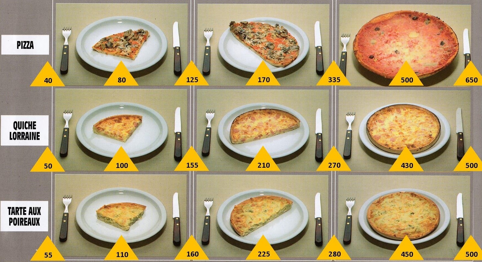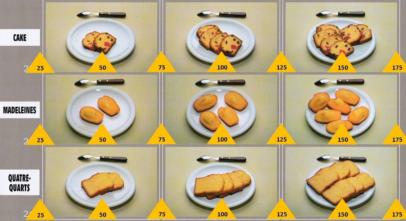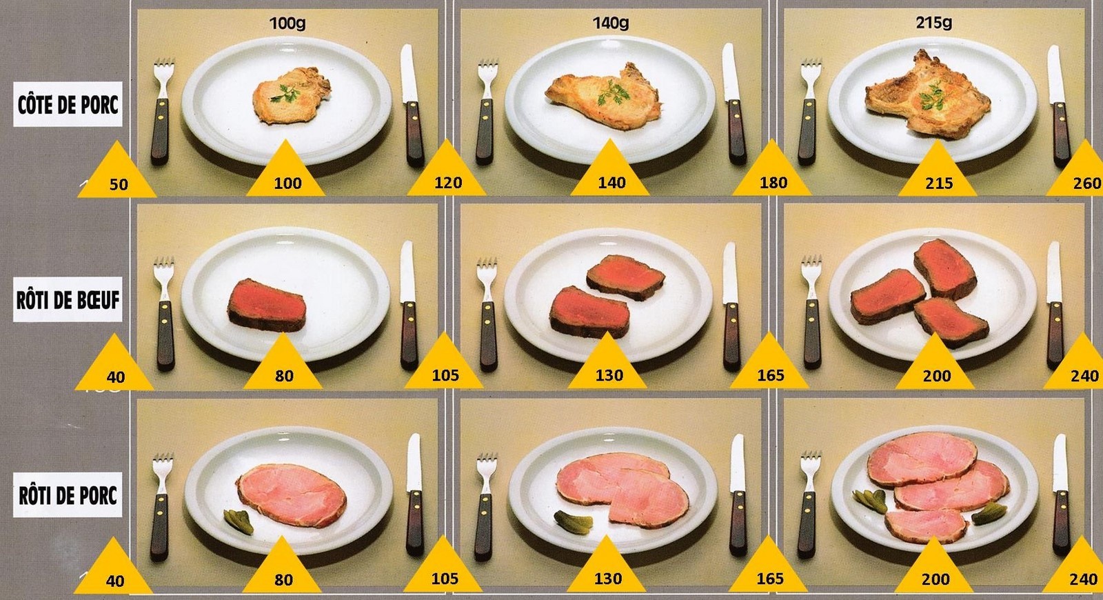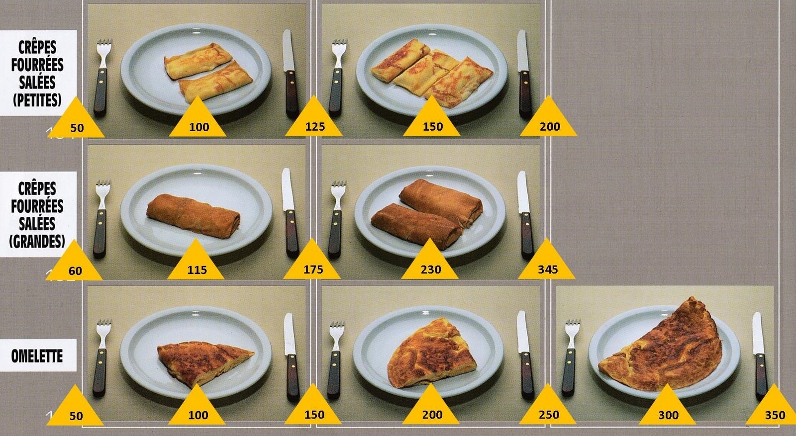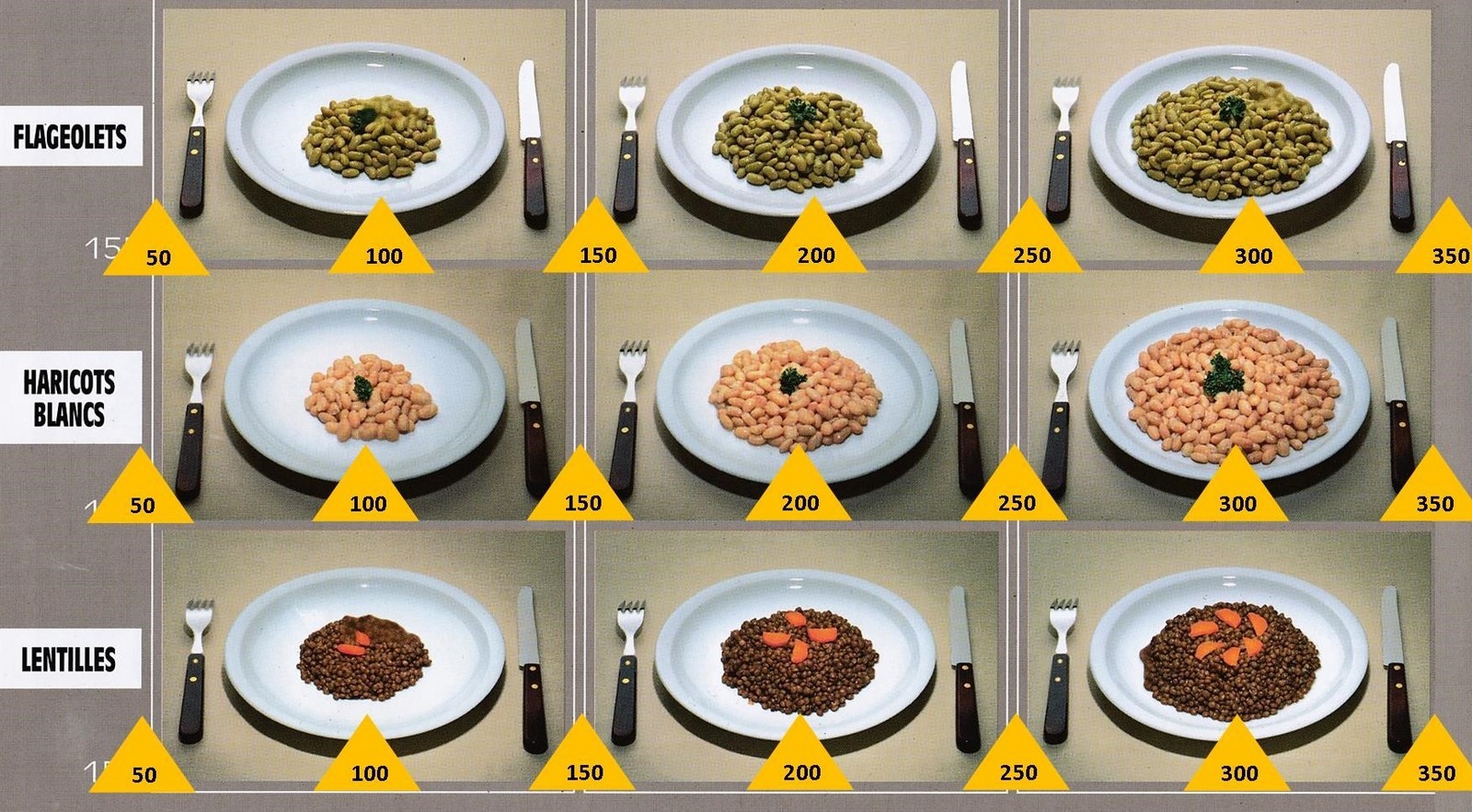 Le poids des aliments est noté dans les triangles jaunes, en grammes pour les aliments solides, en millilitres pour les aliments liquides.