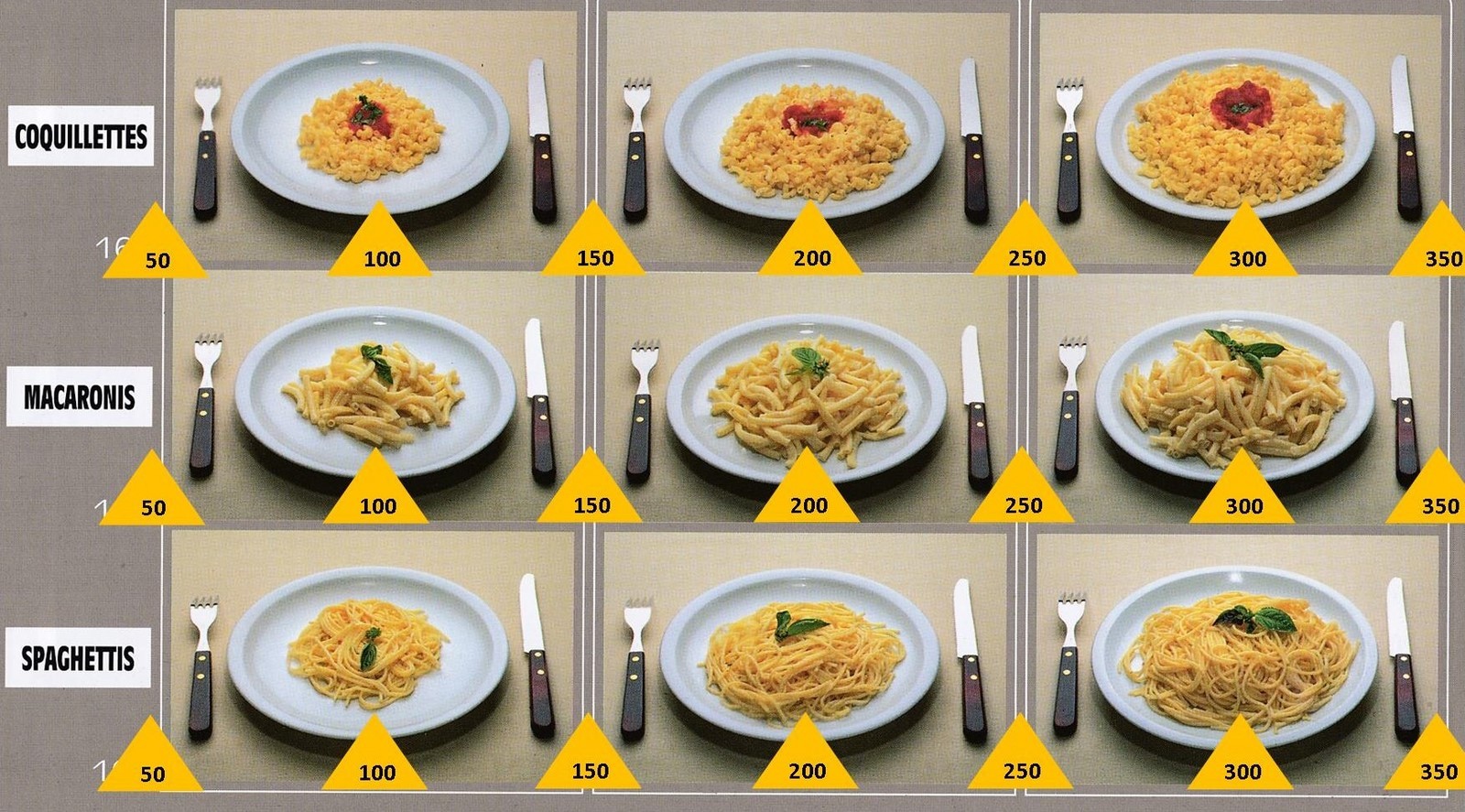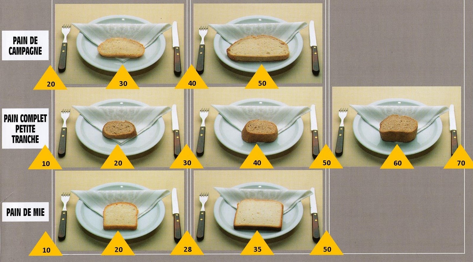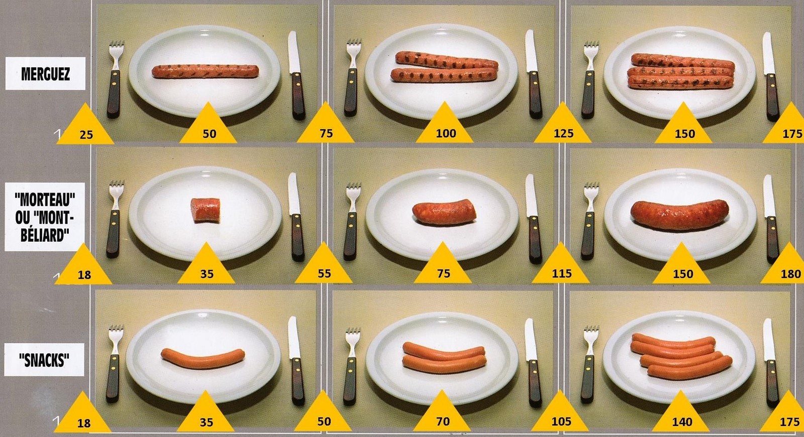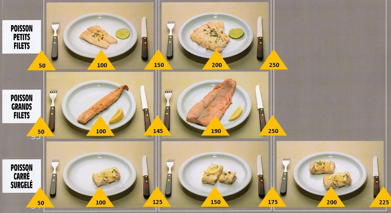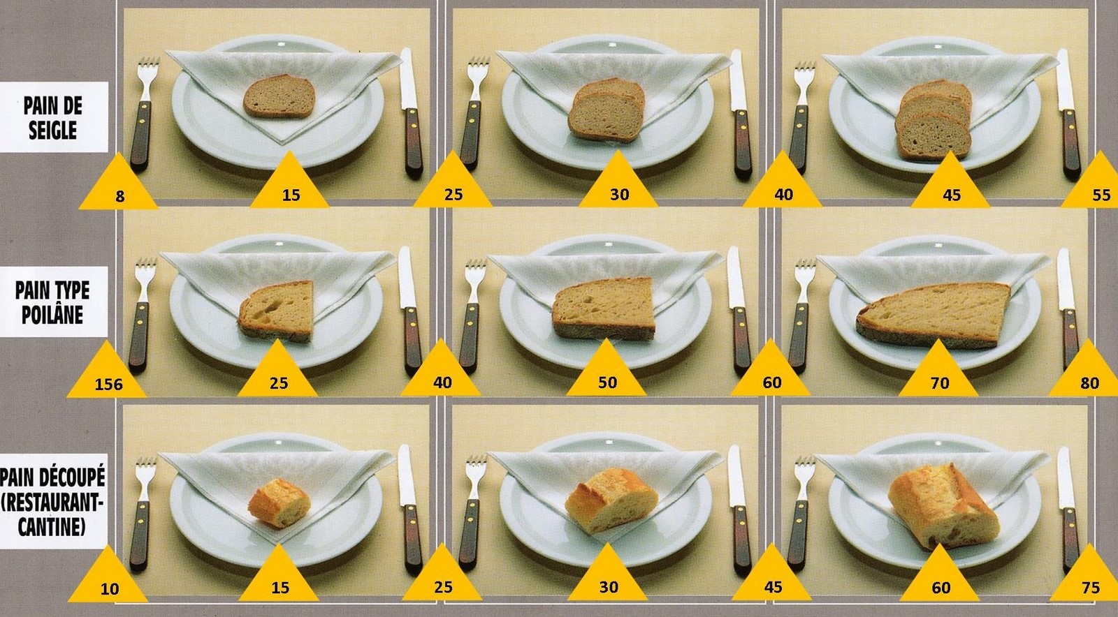 Le poids des aliments est noté dans les triangles jaunes, en grammes pour les aliments solides, en millilitres pour les aliments liquides.