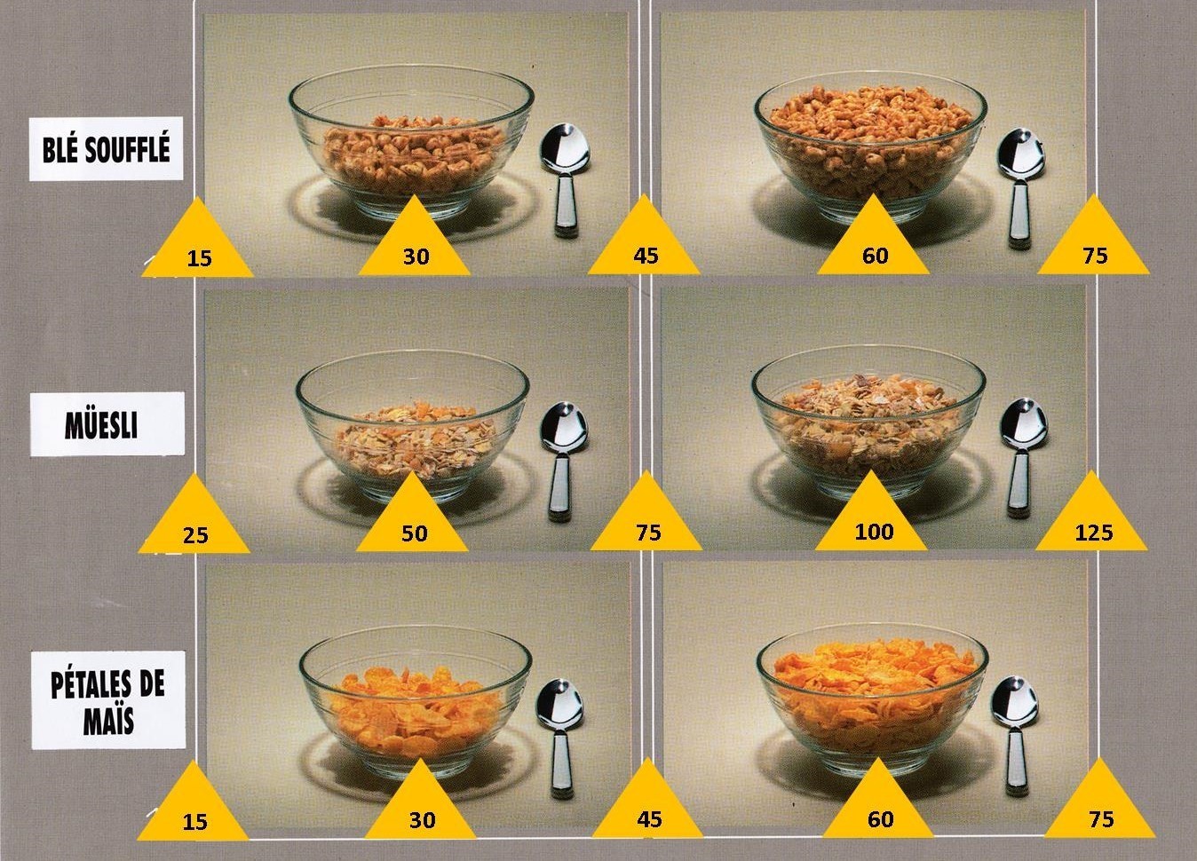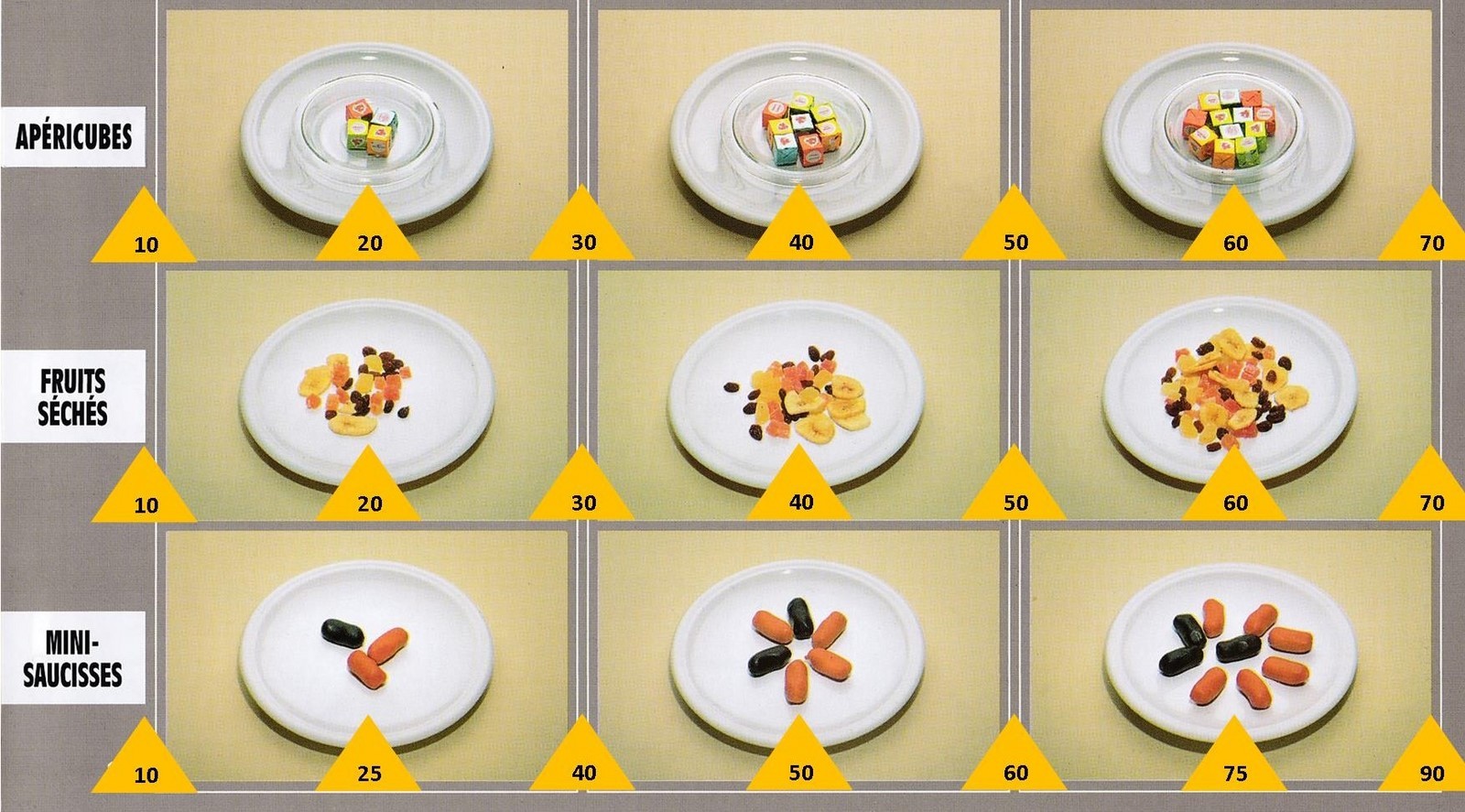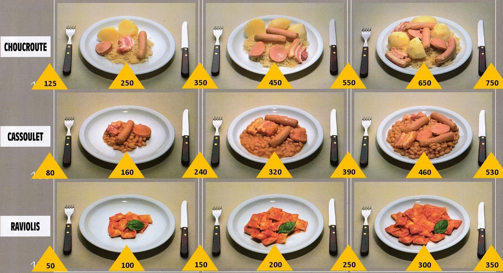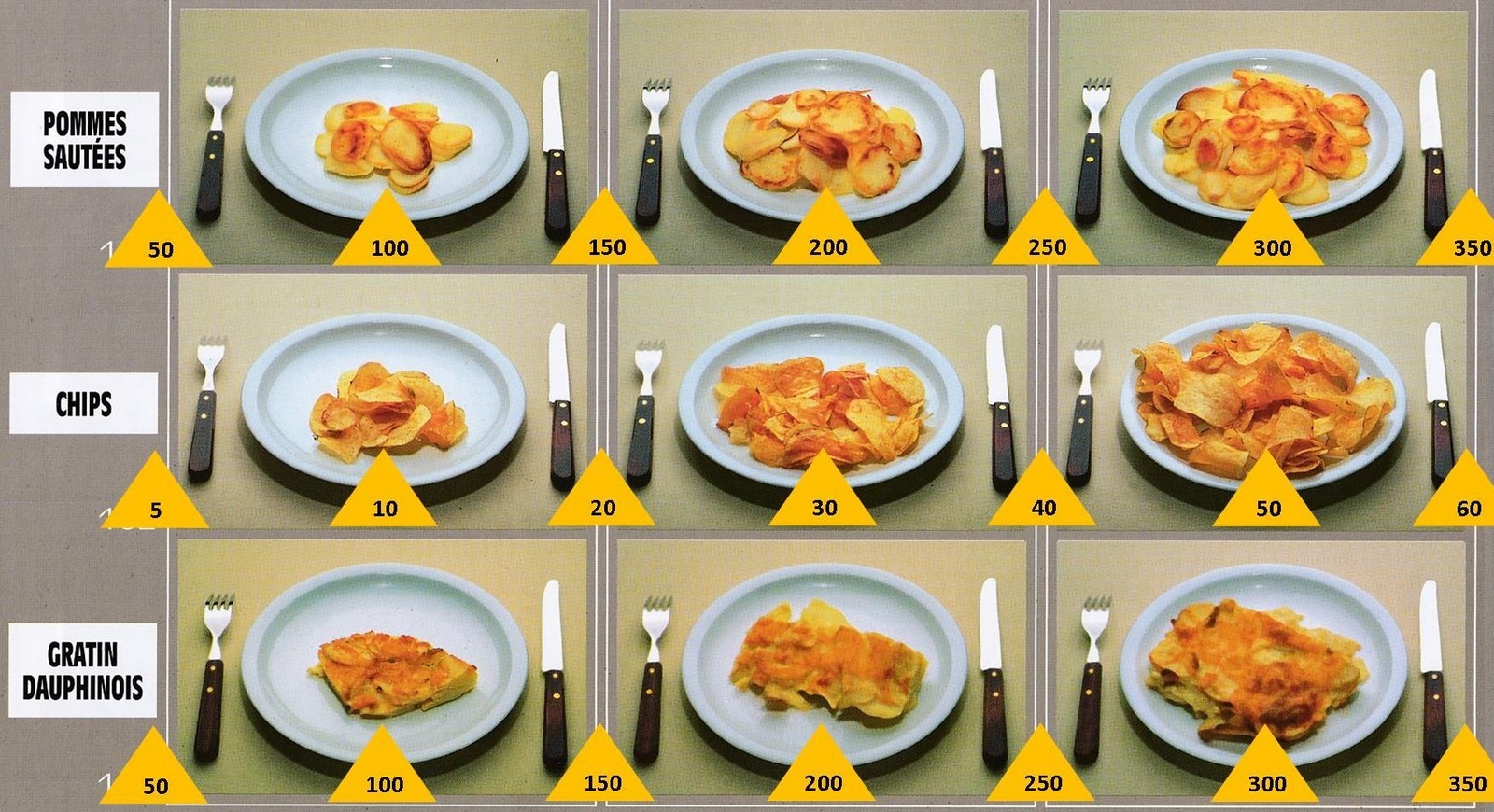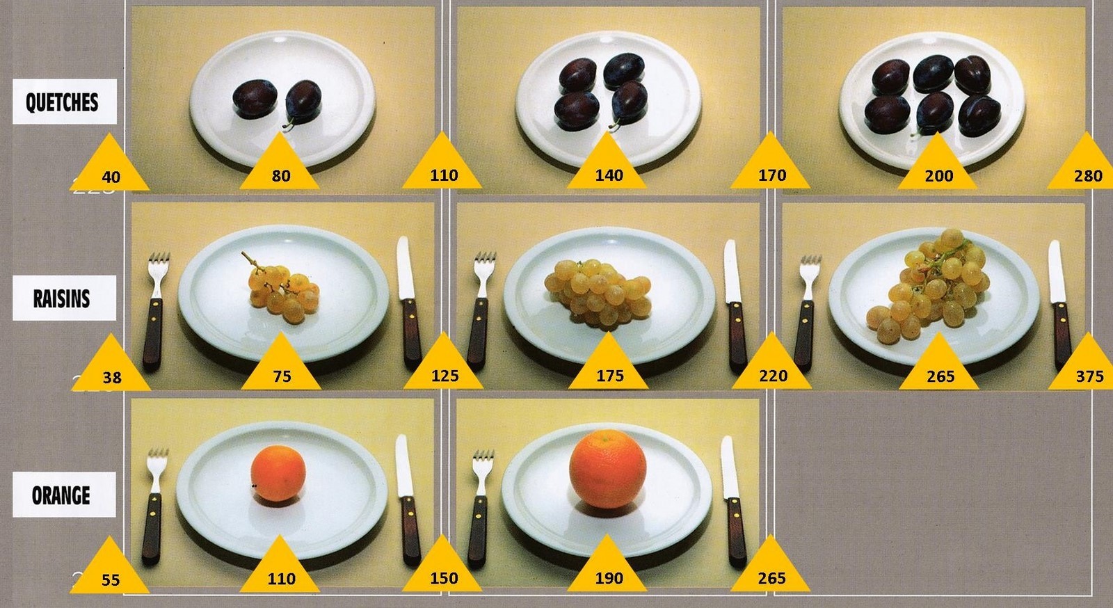 Le poids des aliments est noté dans les triangles jaunes, en grammes pour les aliments solides, en millilitres pour les aliments liquides.