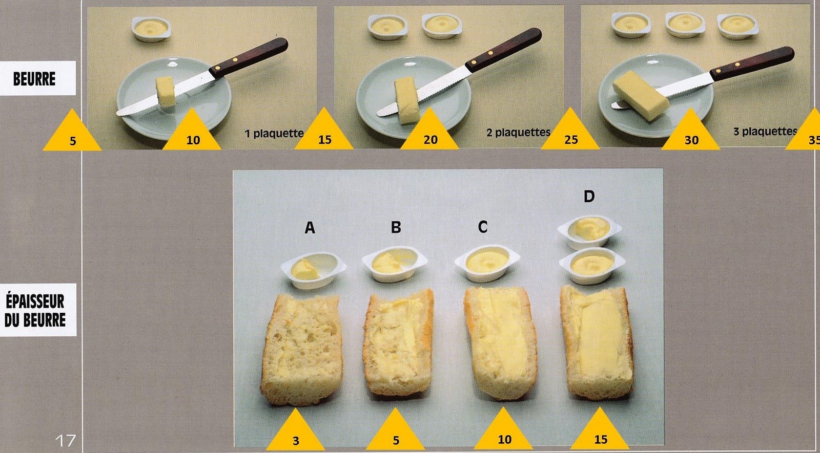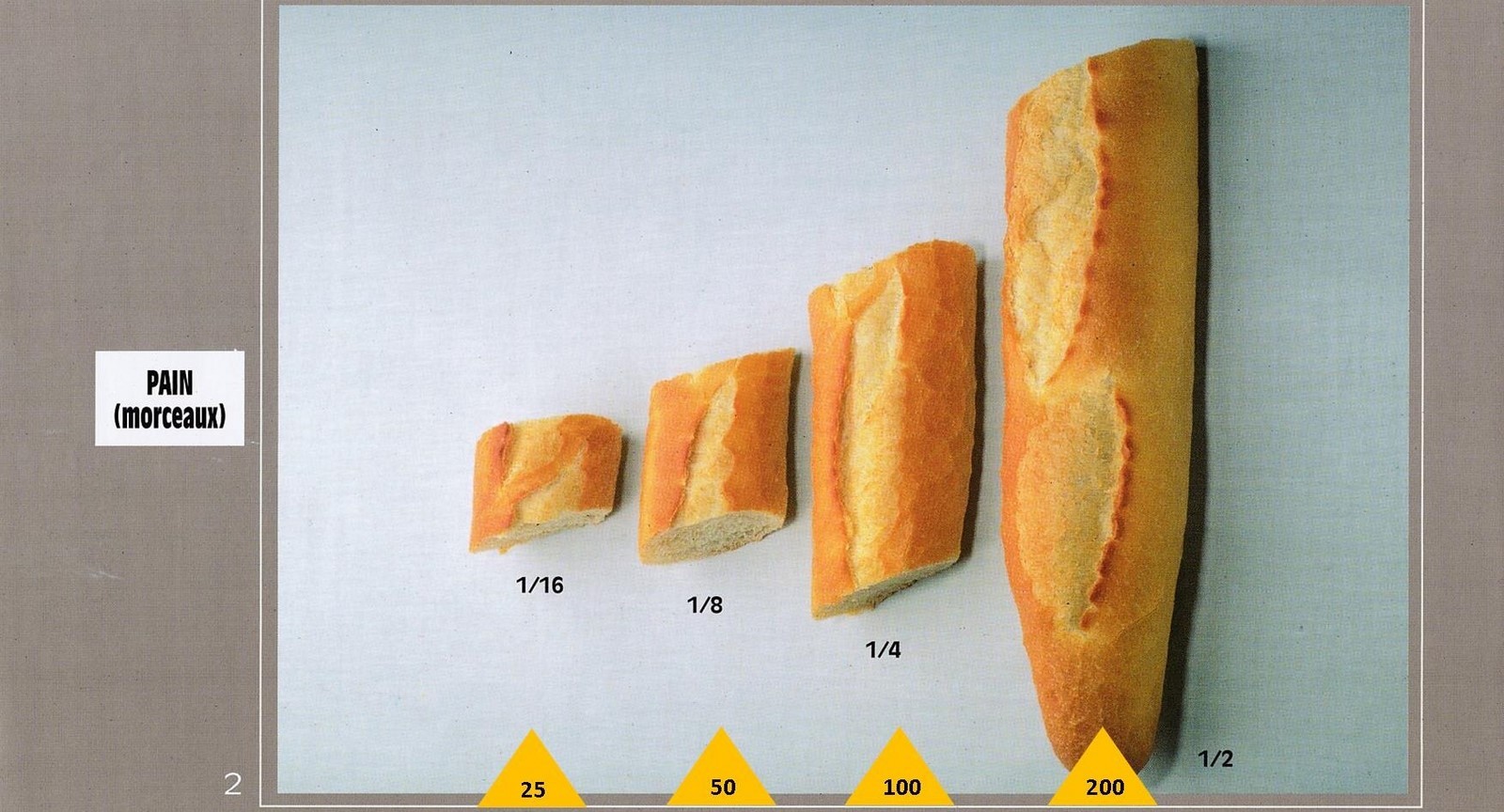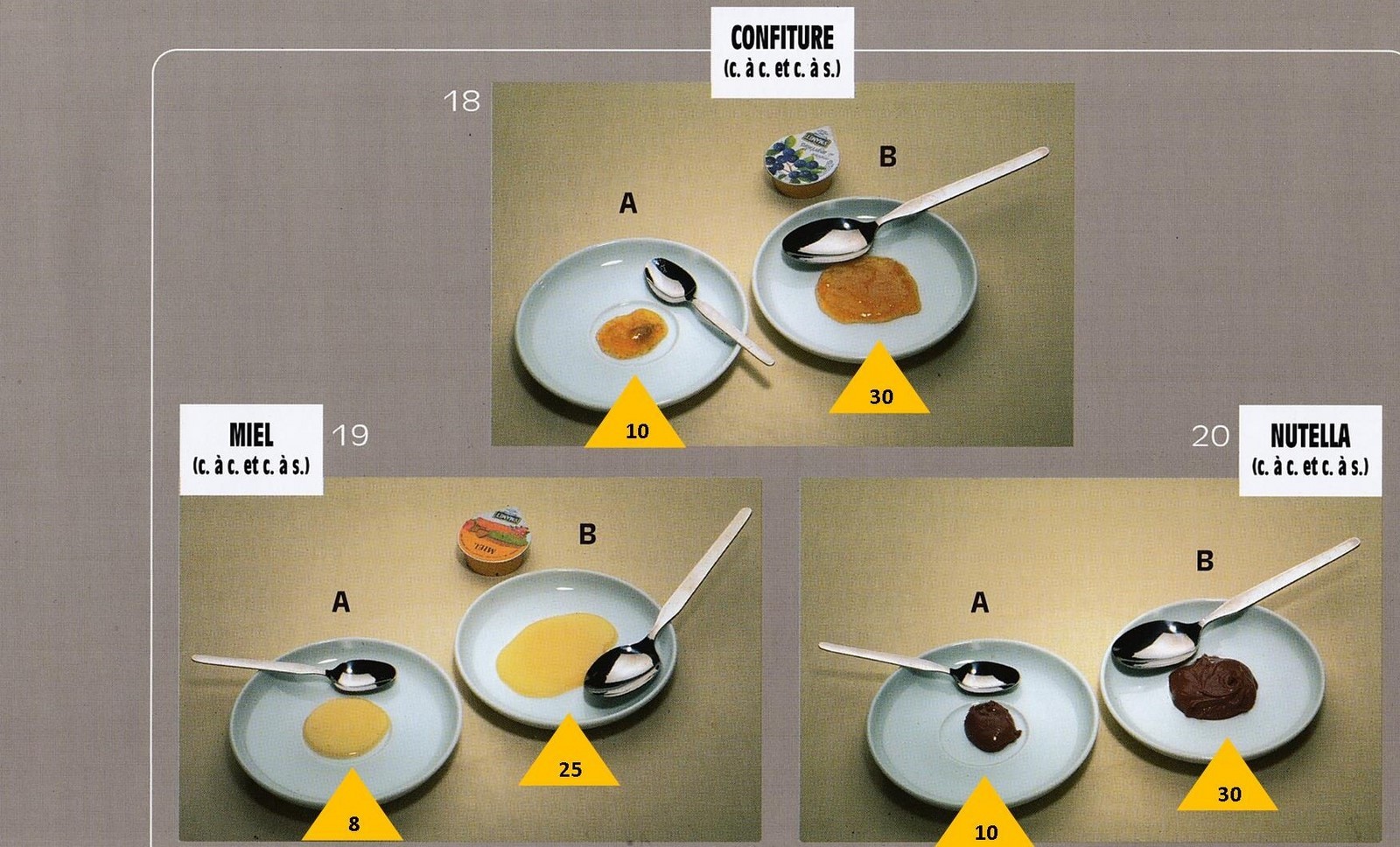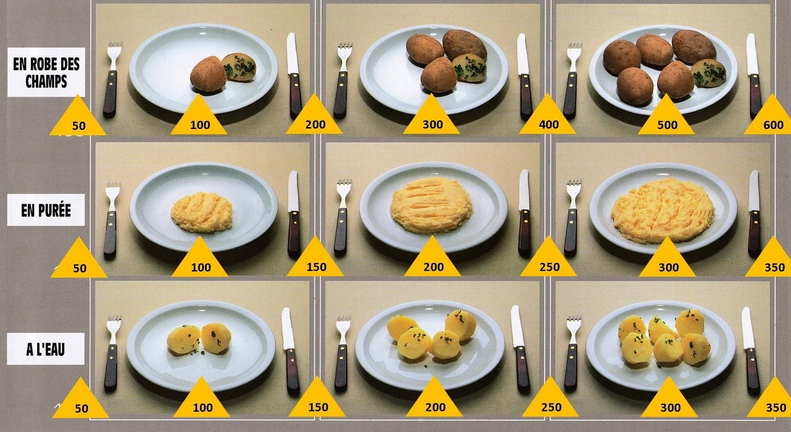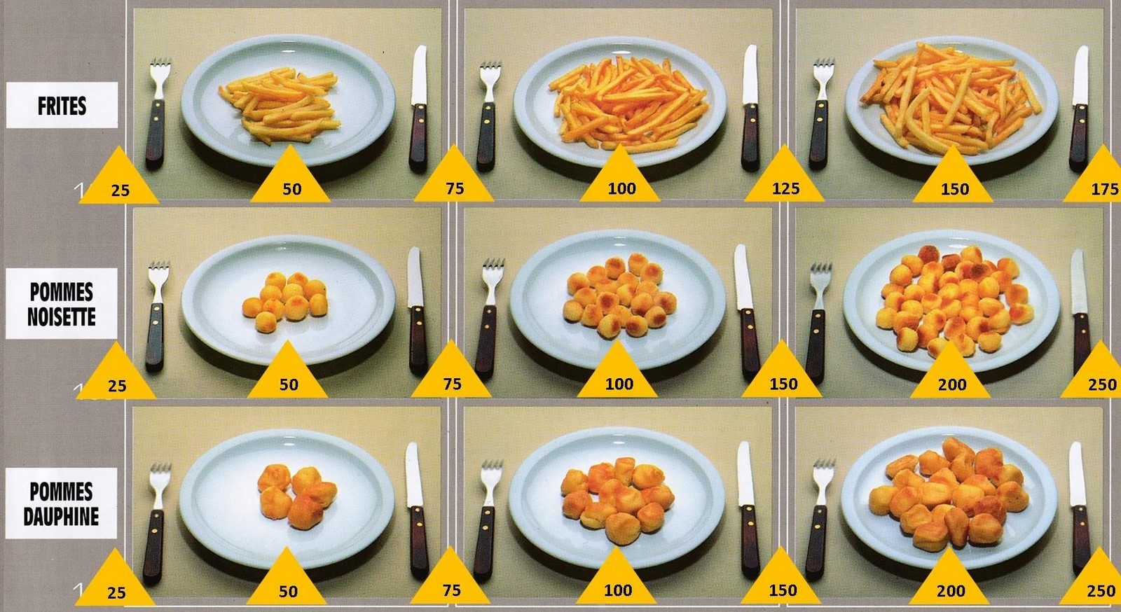 Le poids des aliments est noté dans les triangles jaunes, en grammes pour les aliments solides, en millilitres pour les aliments liquides.