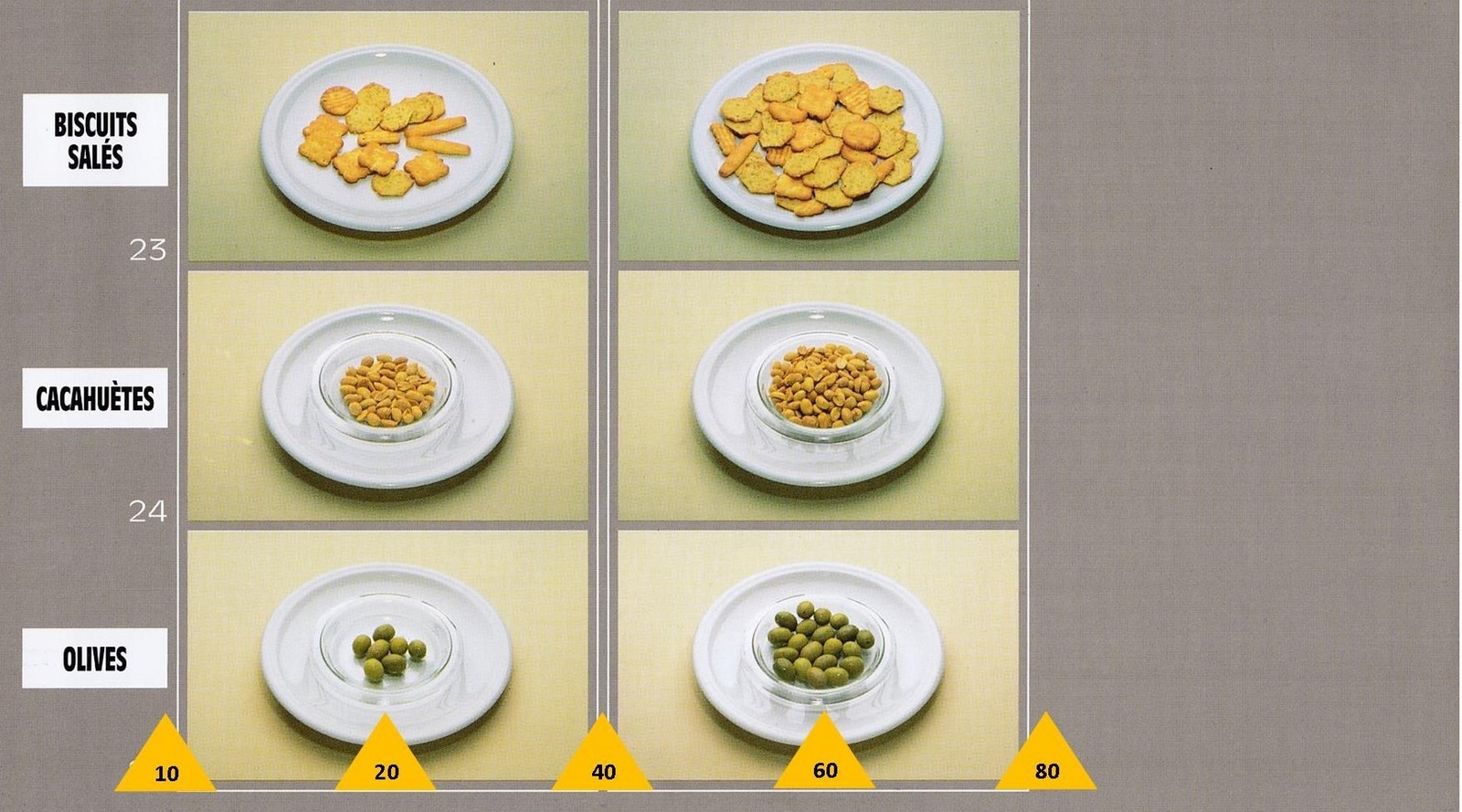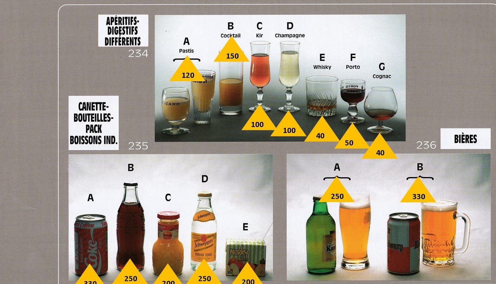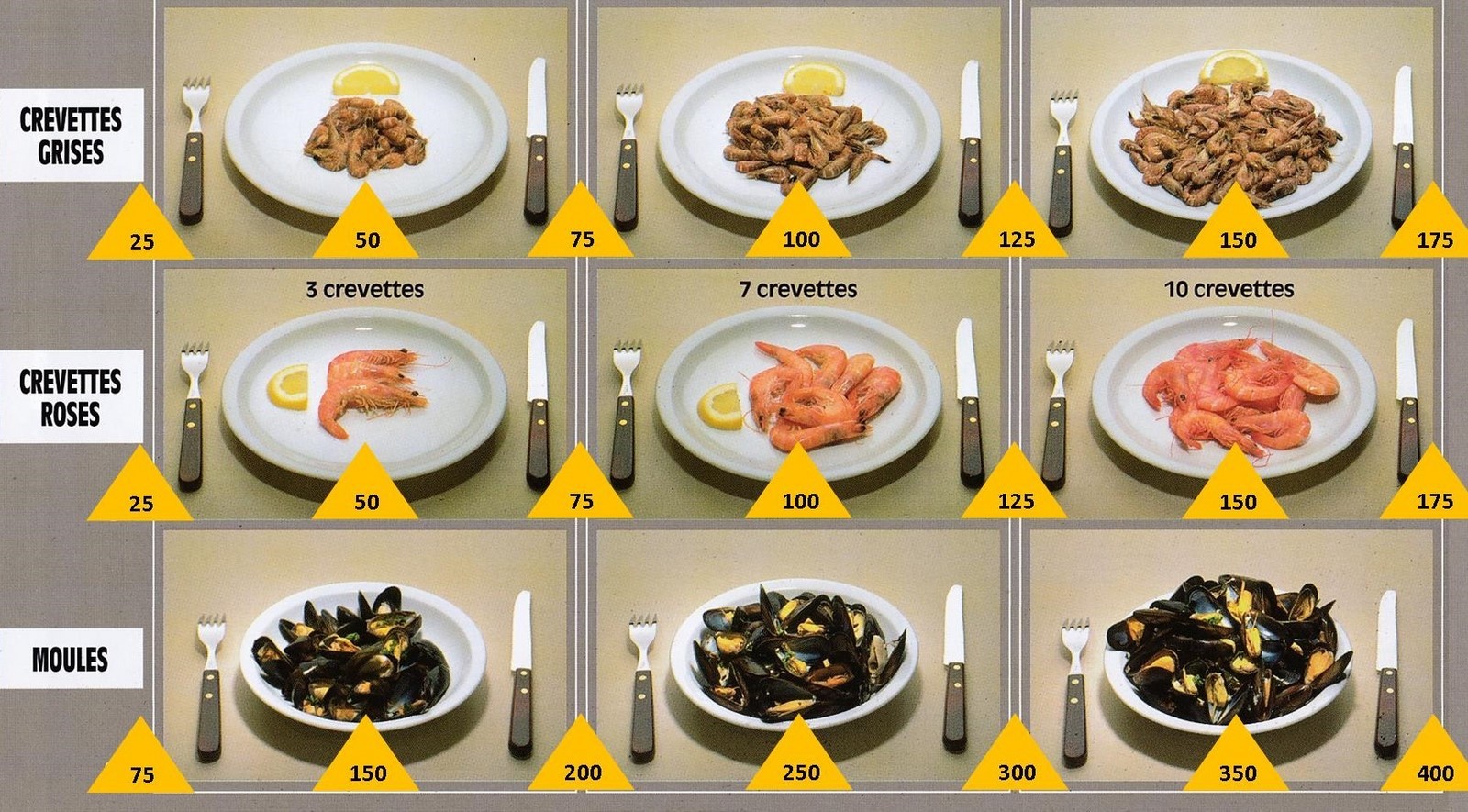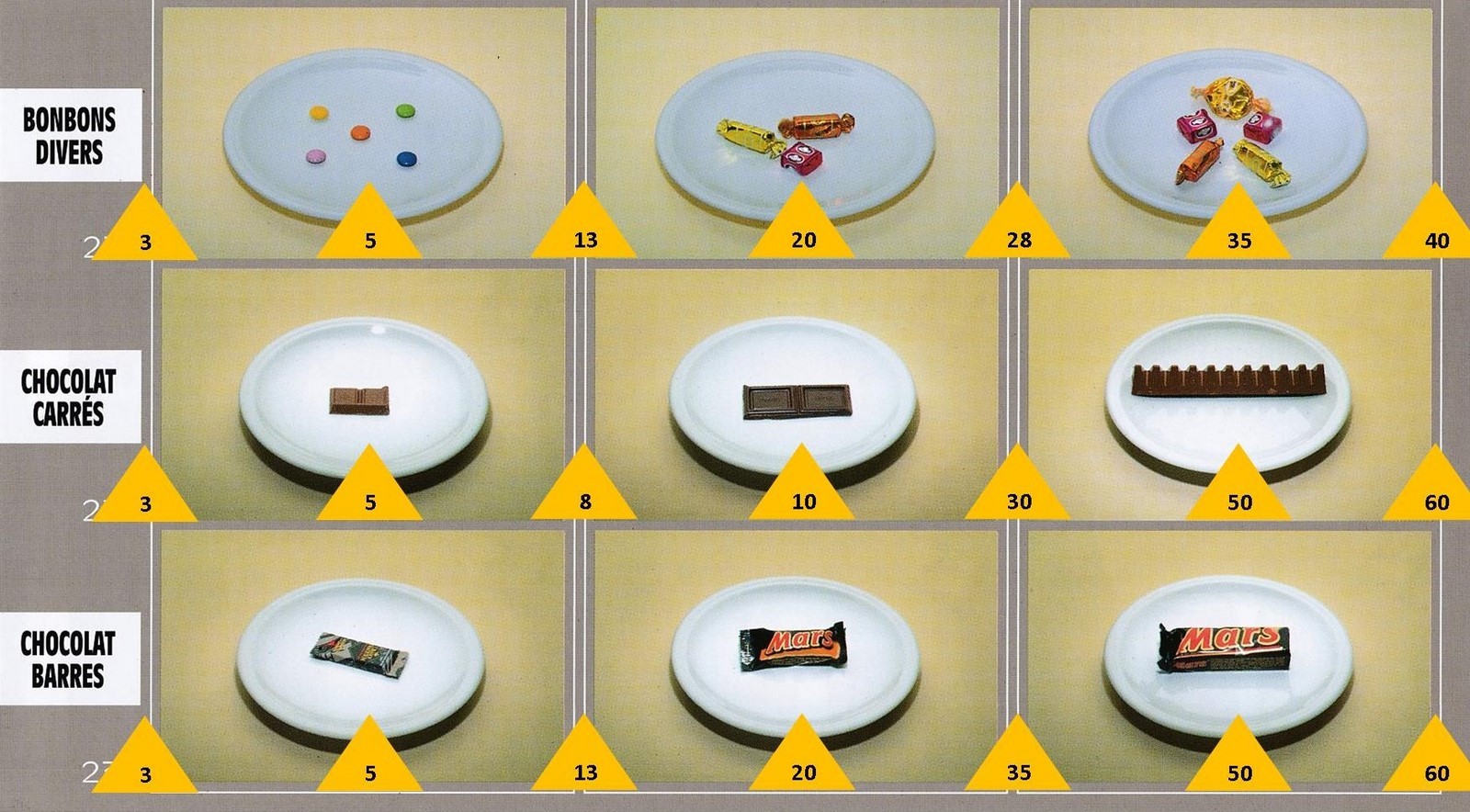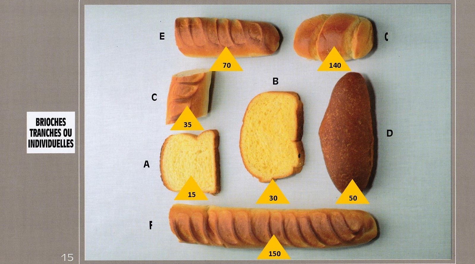 Le poids des aliments est noté dans les triangles jaunes, en grammes pour les aliments solides, en millilitres pour les aliments liquides.